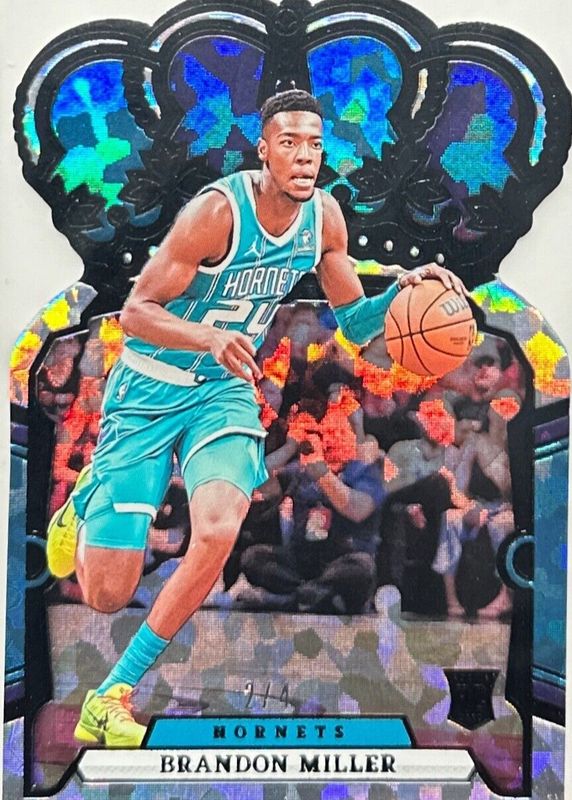 The Brandon Miller 2023 Crown Royale #94 FOTL Black Crystal /4 Rookie card in Raw condition has not changed in price in the last 30 days and was last sold for $191.38 .