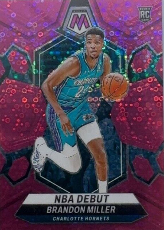 The Brandon Miller 2023 Mosaic #252 NBA Debut - Fast Break Pink /20 Rookie card in Raw condition has not changed in price in the last 30 days and was last sold for $74.01 .