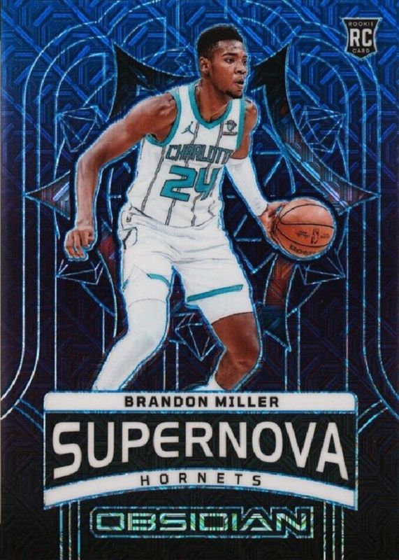 The Brandon Miller 2023 Obsidian #6 Supernova - Electric Etch Deep Sea Mojo /5 Rookie card in Raw condition has not changed in price in the last 30 days and was last sold for $195.00 .