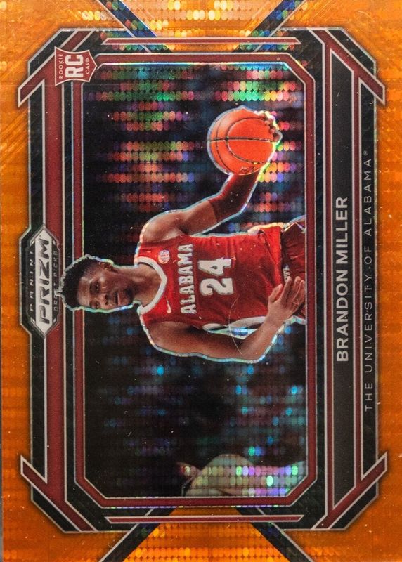 The Brandon Miller 2023 Prizm Draft Picks #63 Variation - Orange Pulsar /49 Rookie card in Raw condition has not changed in price in the last 30 days and was last sold for $20.00 .