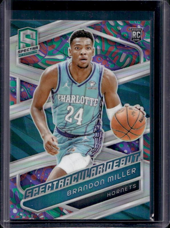 The Brandon Miller 2023 Spectra #193 Psychedelic Rookie card is 1 of 96 Brandon Miller's card variations in the 2023 Spectra set being tracked by Sports Card Investor, including #161 Base, #193 Base, #193 Spectacular Debut, #161 International, and #193 International.