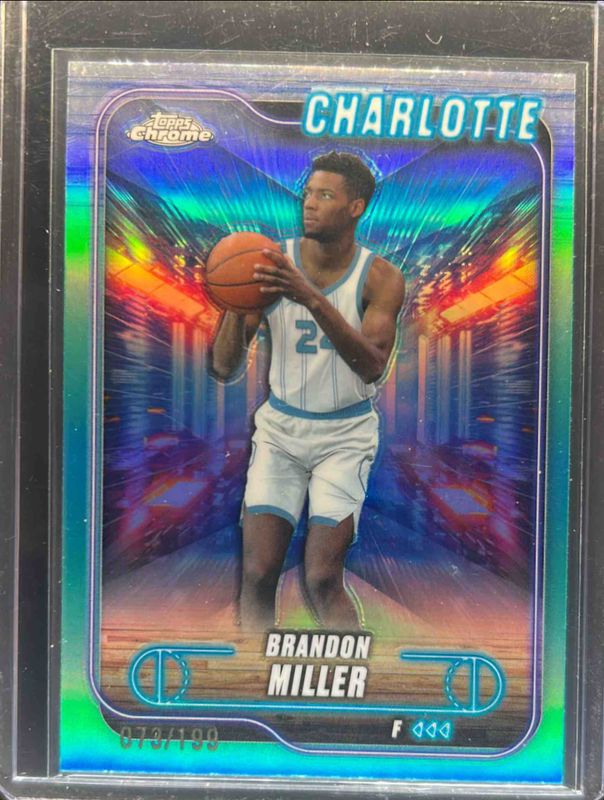 The Brandon Miller 2024 Topps Chrome #61 Aqua Refractor /199 card is 1 of 108 Brandon Miller's card variations in the 2024 Topps Chrome set being tracked by Sports Card Investor, including Base, Blue Basketball Refractor, Magenta Refractor, Negative Refractor, and Pink Basketball Refractor.