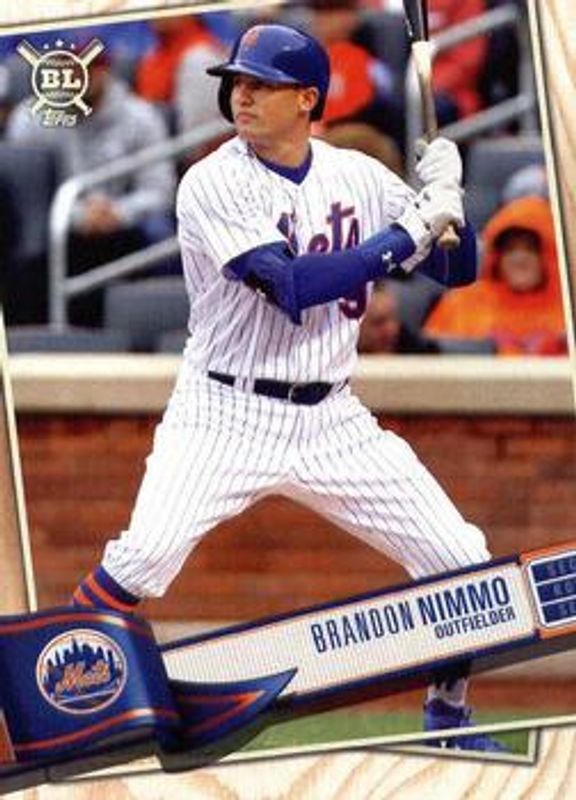 The Brandon Nimmo 2019 Topps Big League #89 Base card is 1 of 10 Brandon Nimmo's card variations in the 2019 Topps Big League set being tracked by Sports Card Investor, including Blue, Gold, Rainbow Foil /100, Artist Rendition /50, and Red Foil /1.