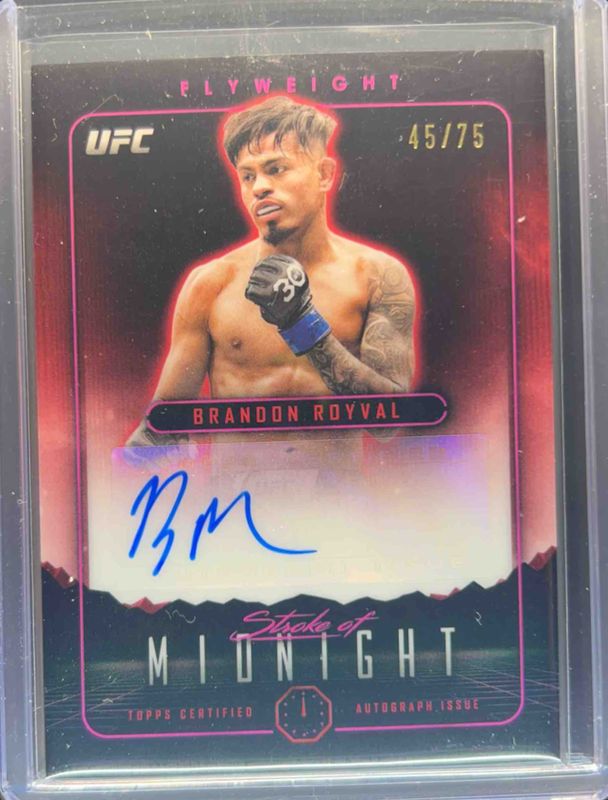 The Brandon Royval 2024 Topps Midnight UFC #SMA-BRL Stroke of Midnight Autographs - Twilight /75 card is 1 of 7 Brandon Royval's card variations in the 2024 Topps Midnight UFC set being tracked by Sports Card Investor, including Stroke of Midnight Autographs, Stroke of Midnight Autographs - Moon Beam, Stroke of Midnight Autographs - Moonrise /25, Stroke of Midnight Autographs - Midnight /12, and Stroke of Midnight Autographs Day Break /5.