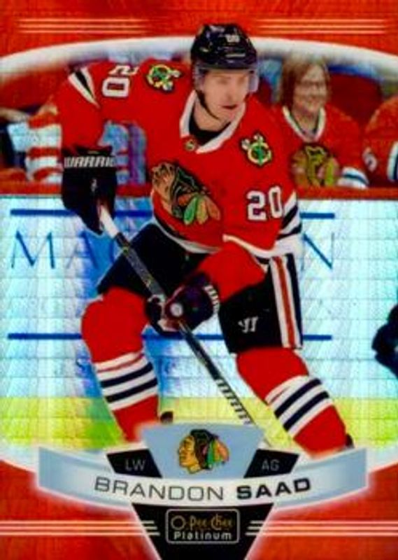 The Brandon Saad 2019 O-Pee-Chee Platinum #33 Red Prism /199 card is 1 of 12 Brandon Saad's card variations in the 2019 O-Pee-Chee Platinum set being tracked by Sports Card Investor, including Base, Matte Pink, Rainbow, Sunset, and Violet Pixels /399.