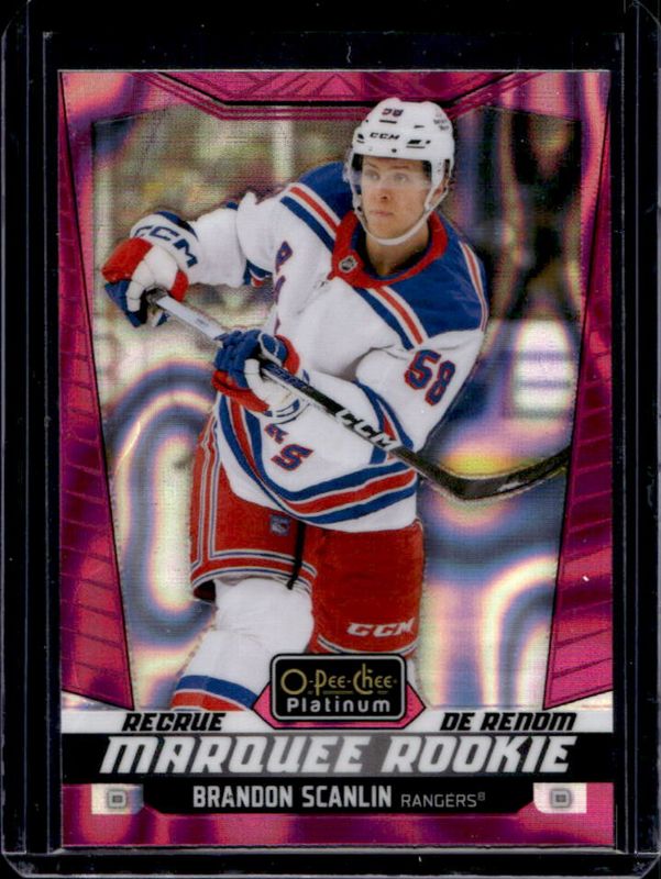The Brandon Scanlin 2024 O-Pee-Chee Platinum #243 Pink Magma Rookie card is 1 of 15 Brandon Scanlin's card variations in the 2024 O-Pee-Chee Platinum set being tracked by Sports Card Investor, including Base, Neon Yellow Surge, Rainbow, Sunset, and Violet Pixels /299.