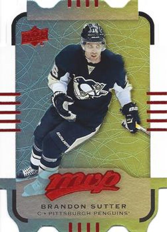 The Brandon Sutter 2015 Upper Deck MVP #38 Colours & Contours card is 1 of 10 Brandon Sutter's card variations in the 2015 Upper Deck MVP set being tracked by Sports Card Investor, including Base, Green (e Pack), Silver Script, Gold Script /100, and Super Script /25.