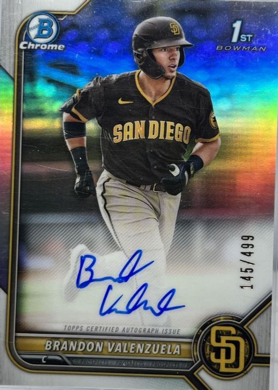 BRANDON VALENZUELA 2022 BOWMAN CHROME 1ST REFRACTOR PADRES PROSPECT AUTO #D /499