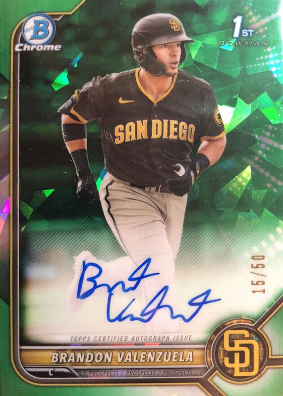 2022 Bowman Chrome Sapphire Brandon Valenzuela Green Auto /50 San Diego Padres!!