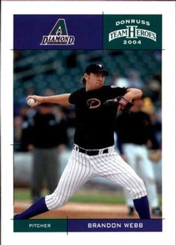 The Brandon Webb 2004 Donruss Team Heroes #24 Base card is 1 of 5 Brandon Webb's card variations in the 2004 Donruss Team Heroes set being tracked by Sports Card Investor, including Showdown - Bronze /150, Showdown - Silver /50, Showdown - Gold /10, and Autographs /10.