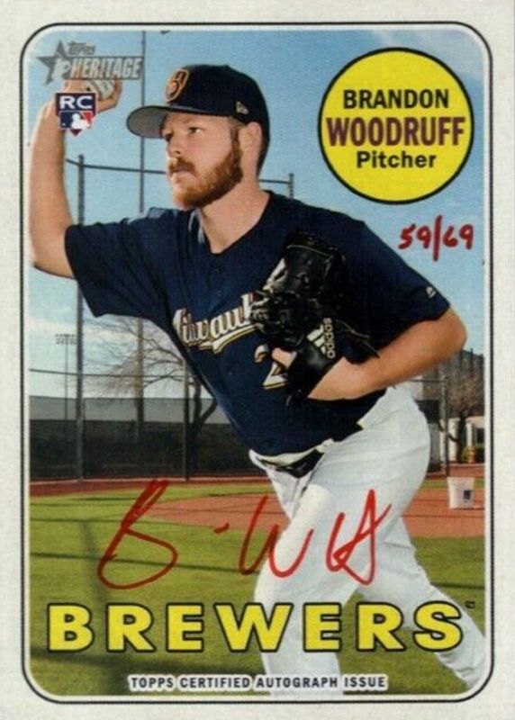 Brandon Woodruff's Baseball cards are available in at least 45 sets. Brandon Woodruff's biggest 7-day price movers are 2018 Topps Heritage High Number #ROA-BW Real One Autographs - Red Ink /69, 2024 Topps Museum Collection #MM-BW Museum Memorabilia Laundry Tag Relics /1, and 2024 Topps Museum Collection #MM-BW Museum Memorabilia /1.
