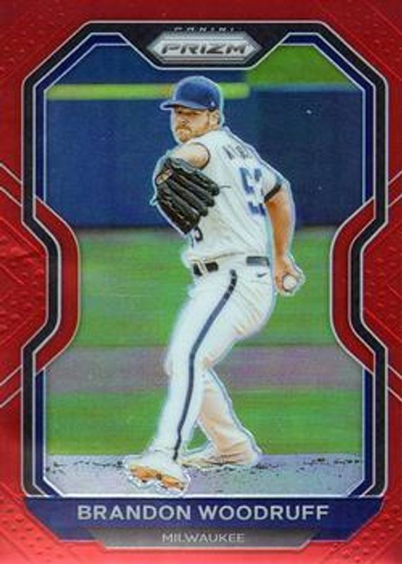 The Brandon Woodruff 2021 Prizm #18 Red card is 1 of 42 Brandon Woodruff's card variations in the 2021 Prizm set being tracked by Sports Card Investor, including Blue, Blue Velocity, Carolina Blue, Cosmic Haze, and Giraffe.