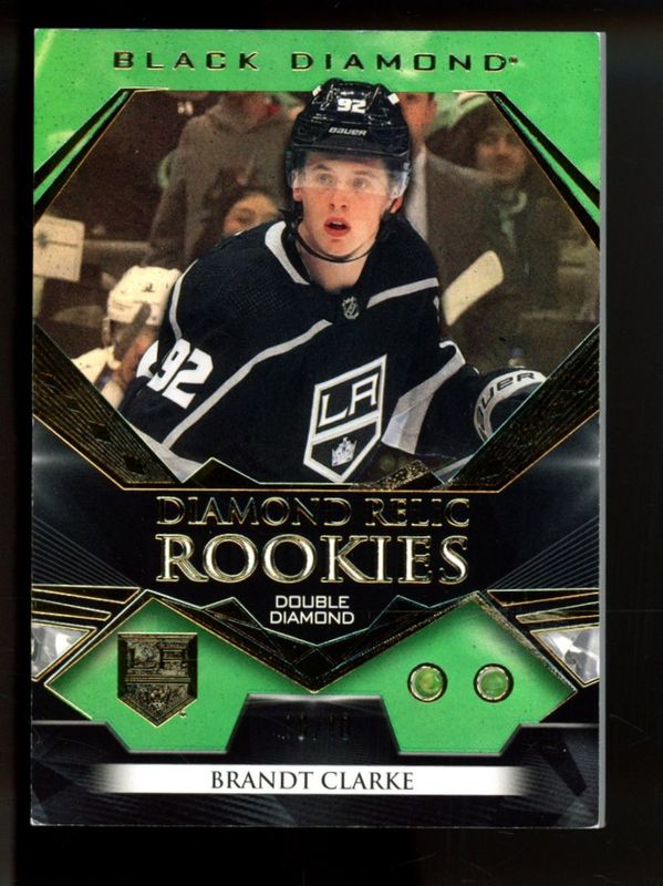 The Brandt Clarke 2022 Upper Deck Black Diamond #BDR-BC Diamond Relic Rookie Gems Emerald /10 card is 1 of 54 Brandt Clarke's card variations in the 2022 Upper Deck Black Diamond set being tracked by Sports Card Investor, including Base /349, Diamond Relic Rookie Gems /99, Red /75, Diamond Relic Rookie Gems Ruby /49, and Pure Black Autographs /49.