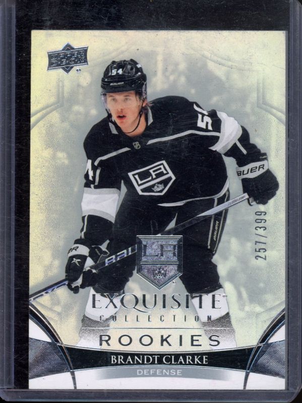 The Brandt Clarke 2022 Upper Deck Black Diamond #R-BC Exquisite Collection Rookies /399 card is 1 of 54 Brandt Clarke's card variations in the 2022 Upper Deck Black Diamond set being tracked by Sports Card Investor, including Base /349, Diamond Relic Rookie Gems /99, Red /75, Diamond Relic Rookie Gems Ruby /49, and Pure Black Autographs /49.