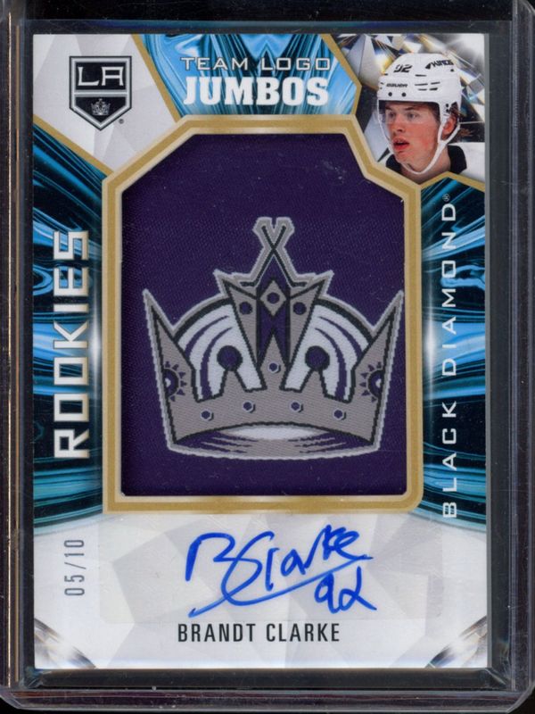 The Brandt Clarke 2022 Upper Deck Black Diamond #RTL-BC Rookie Team Logo Jumbo Patches Auto Manufactured Patch Full Logo 4 /10 card is 1 of 54 Brandt Clarke's card variations in the 2022 Upper Deck Black Diamond set being tracked by Sports Card Investor, including Base /349, Diamond Relic Rookie Gems /99, Red /75, Diamond Relic Rookie Gems Ruby /49, and Pure Black Autographs /49.