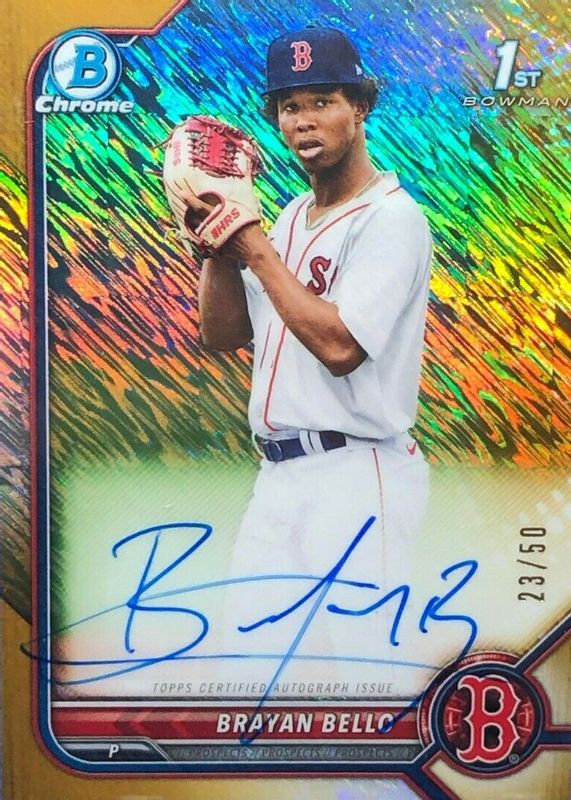 Best Prices Available For Sale of Brayan Bello 2022 Bowman #CPA-BB Chrome Prospect Auto - Gold Shimmer Refractor /50 (1st)