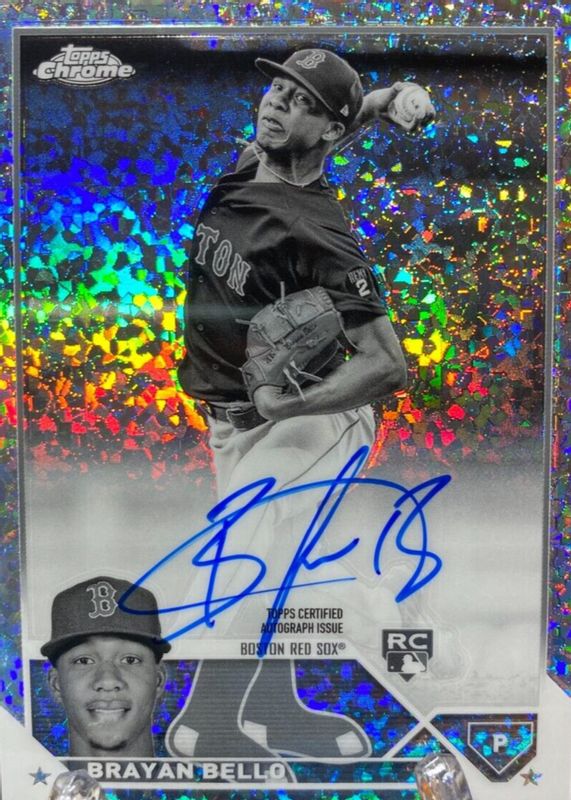 The Brayan Bello 2023 Topps Chrome #RA-BB Rookie Autographs - Black & White Mini-Diamond Refractor card in Raw condition has not changed in price in the last 30 days and was last sold for $63.00 .