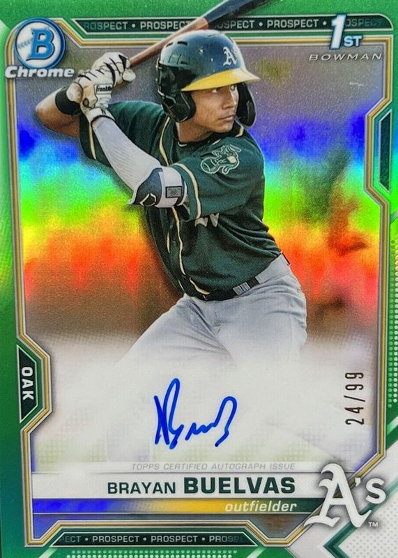 The Brayan Buelvas 2021 Bowman #CPA-RDC Chrome Prospect Auto - Green Refractor /99 (1st) Rookie card in Raw condition has not changed in price in the last 30 days and was last sold for $17.79 .
