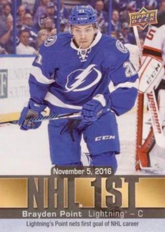 The Brayden Point 2016 Upper Deck #NF-2 NHL Firsts Rookie card is 1 of 30 Brayden Point's card variations in the 2016 Upper Deck set being tracked by Sports Card Investor, including Young Guns Base, Young Guns Canvas, Young Guns - Clear Cut, Young Guns - Gold Rainbow Foil, and Young Guns - Jumbo.