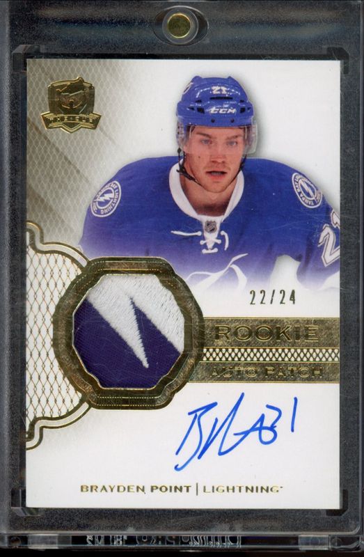 The Brayden Point 2016 Upper Deck The Cup #142 Gold Patch /24 Rookie card is 1 of 65 Brayden Point's card variations in the 2016 Upper Deck The Cup set being tracked by Sports Card Investor, including Base /249, Team Canada Autographs, Gold Spectrum /12, Red Tag /8, and Green Button /3.