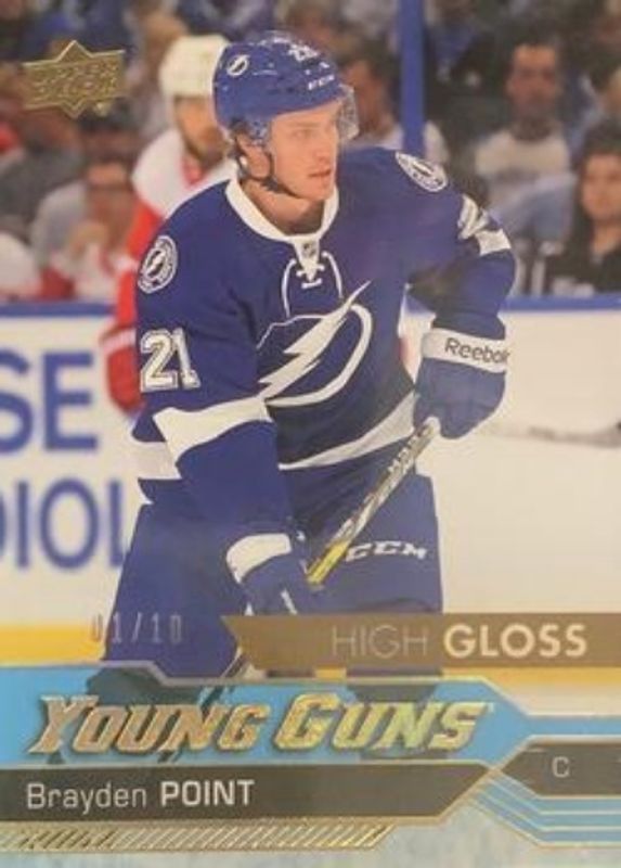 The Brayden Point 2016 Upper Deck #205 UD High Gloss /10 Rookie card is 1 of 30 Brayden Point's card variations in the 2016 Upper Deck set being tracked by Sports Card Investor, including Young Guns Base, Young Guns Canvas, Young Guns - Clear Cut, Young Guns - Gold Rainbow Foil, and Young Guns - Jumbo.