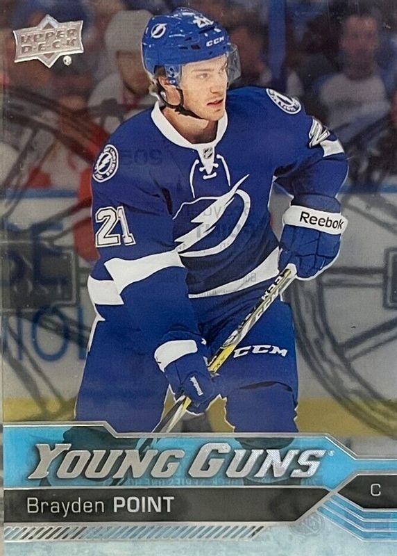 This card is 1 of 9 Brayden Point's card variations in the 2016 Upper Deck set being tracked by Sports Card Investor, including Young Guns Base, Young Guns Canvas, Young Guns - Gold Rainbow Foil, Young Guns - Jumbo, and Young Guns - Silver Foil.