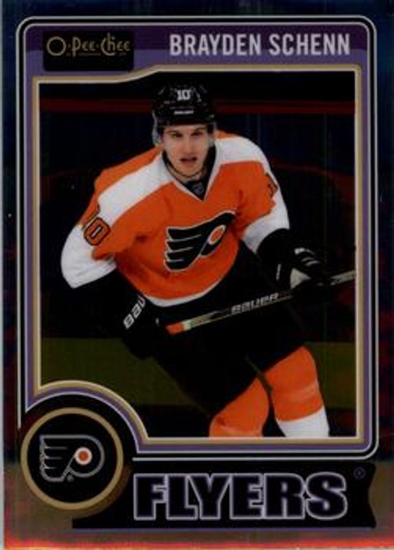 The Brayden Schenn 2014 O-Pee-Chee Platinum #7 Base card is 1 of 13 Brayden Schenn's card variations in the 2014 O-Pee-Chee Platinum set being tracked by Sports Card Investor, including Platinum Traxx, Rainbow, White Ice /199, Red Prism /135, and Blue Cube /65.