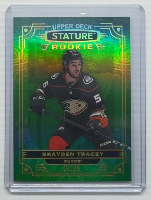 The Brayden Tracey 2022 Upper Deck Stature #184 Green /99 Rookie card is 1 of 43 Brayden Tracey's card variations in the 2022 Upper Deck Stature set being tracked by Sports Card Investor, including Base /399, Photo Variant /99, Red /75, Photo Variant Green /66, and Design Variant /65.
