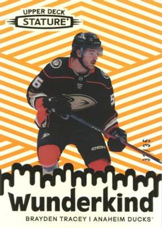 The Brayden Tracey 2022 Upper Deck Stature #W-2 Wunderkind - Orange /35 Rookie card is 1 of 43 Brayden Tracey's card variations in the 2022 Upper Deck Stature set being tracked by Sports Card Investor, including Base /399, Green /99, Photo Variant /99, Red /75, and Photo Variant Green /66.