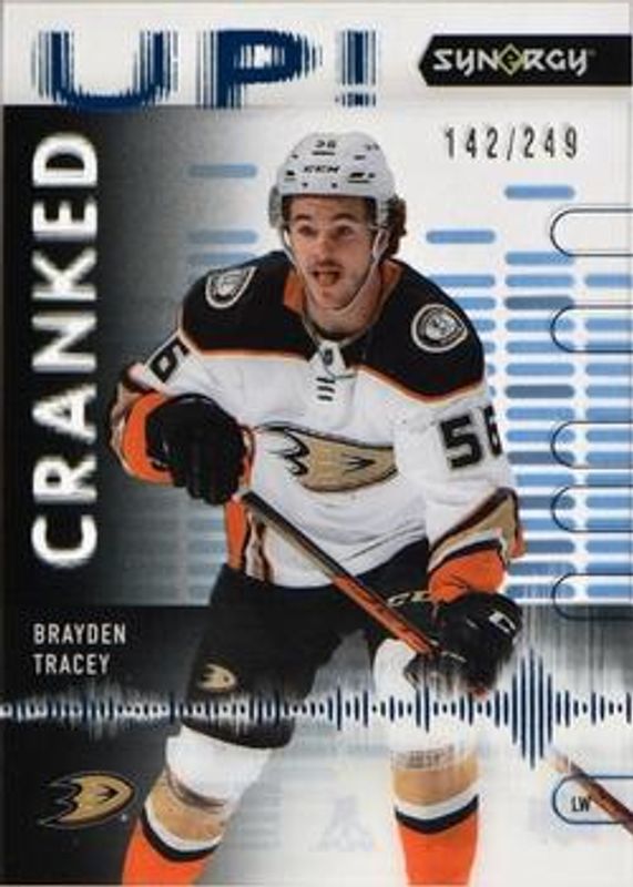 The Brayden Tracey 2022 Upper Deck Synergy #CU-BT Cranked Up - Blue /249 Rookie card is 1 of 35 Brayden Tracey's card variations in the 2022 Upper Deck Synergy set being tracked by Sports Card Investor, including Base /23, Red, Red Codes, Purple /49, and Gold /25.