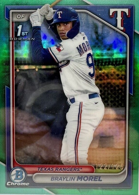 This card is 1 of 51 Braylin Morel's card variations in the 2024 Bowman Chrome set being tracked by Sports Card Investor, including Prospects (1st), Prospects - Shimmer Refractor (1st), Prospects - Refractor /499 (1st), Prospects - Speckle Refractor /299 (1st), and Prospects - Purple Refractor /250 (1st).