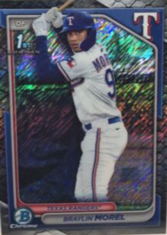 This card is 1 of 51 Braylin Morel's card variations in the 2024 Bowman Chrome set being tracked by Sports Card Investor, including Prospects (1st), Prospects - Shimmer Refractor (1st), Prospects - Refractor /499 (1st), Prospects - Speckle Refractor /299 (1st), and Prospects - Purple Refractor /250 (1st).