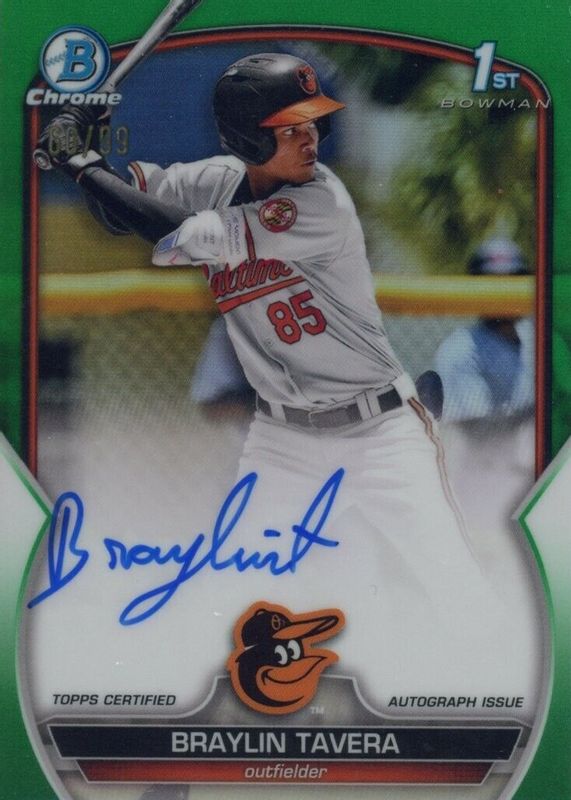 Braylin Tavera Auto 2023 1st Bowman Chrome #CPA-BT Green Refractor 57/99 Orioles