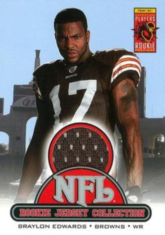 The Braylon Edwards 2005 Upper Deck Rookie Materials #R10 Rookie Jerseys card is 1 of 3 Braylon Edwards' card variations in the 2005 Upper Deck Rookie Materials set being tracked by Sports Card Investor, including Base, and Stars of Tomorrow.