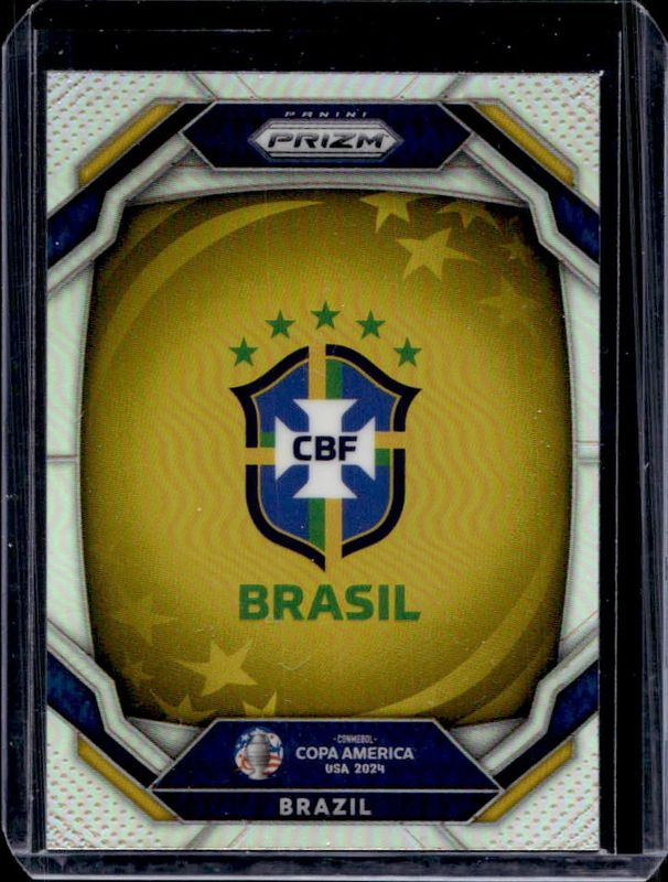 The Brazil 2024 Prizm Copa America #3 Team Badges - Silver card is 1 of 6 Brazil's card variations in the 2024 Prizm Copa America set being tracked by Sports Card Investor, including Team Badges, Team Badges - Orange /25, Team Badges - Gold /10, Team Badges - Green /5, and Team Badges - Black /1.