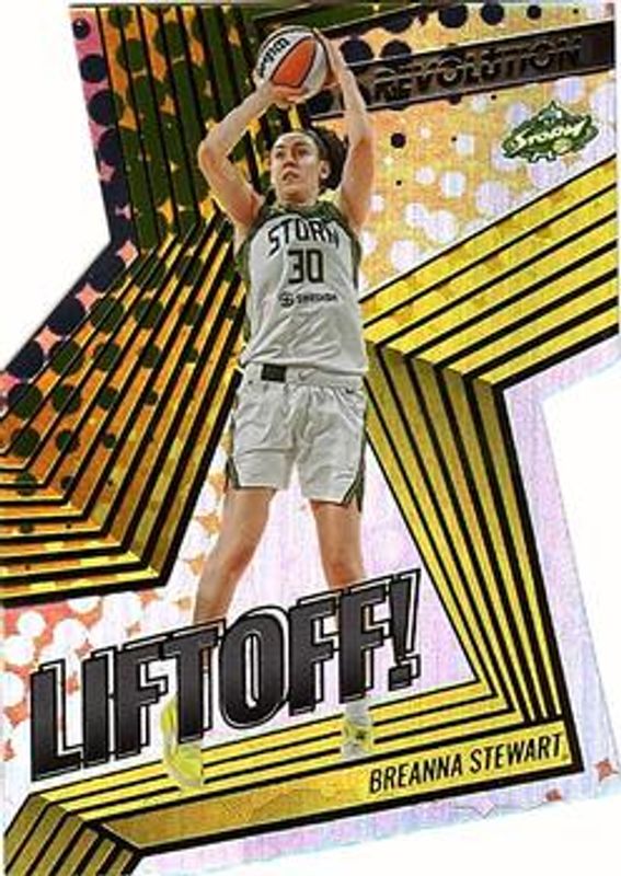 The Breanna Stewart 2022 Revolution WNBA #9 Liftoff! card is 1 of 31 Breanna Stewart's card variations in the 2022 Revolution WNBA set being tracked by Sports Card Investor, including Base, Astro, Fractal, Galactic, and Groove.