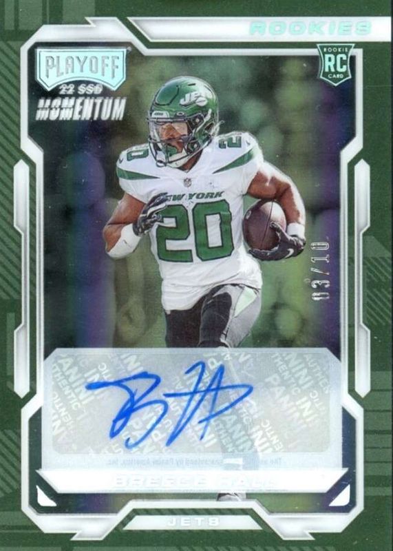 The Breece Hall 2022 Chronicles #PMR-13 Playoff Momentum Rookie Autographs card in Raw condition has not changed in price in the last 30 days and was last sold for $46.00 .