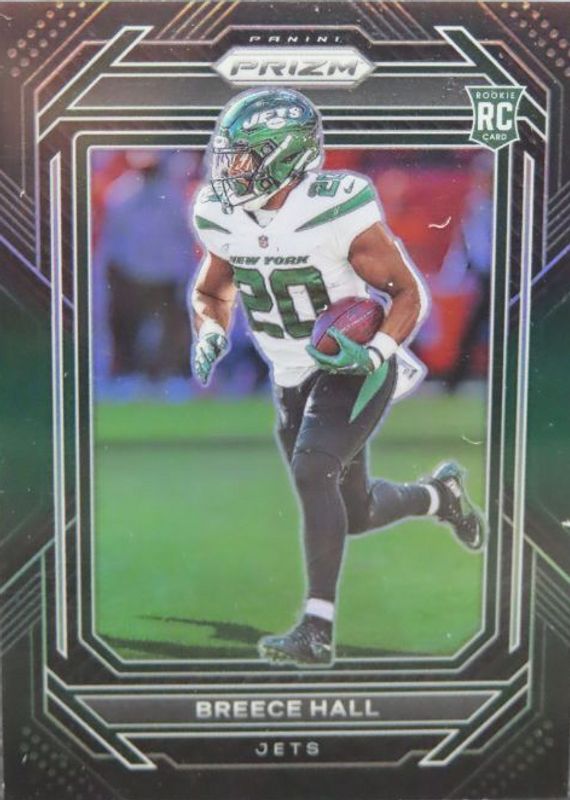The Breece Hall 2022 Chronicles #PB-17 Prizm Black - Green /49 Rookie card in Raw condition has not changed in price in the last 30 days and was last sold for $11.00 .