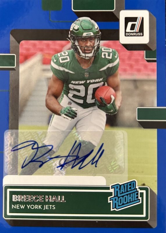 The Breece Hall 2022 Donruss #314 Rated Rookie Autographs - Blue card in Raw condition has not changed in price in the last 30 days and was last sold for $26.76 .