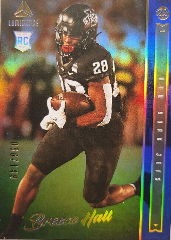 This card is 1 of 9 Breece Hall's card variations in the 2022 Luminance set being tracked by Sports Card Investor, including Base, Gold /249, Green /99, Orange /50, and Teal /35.