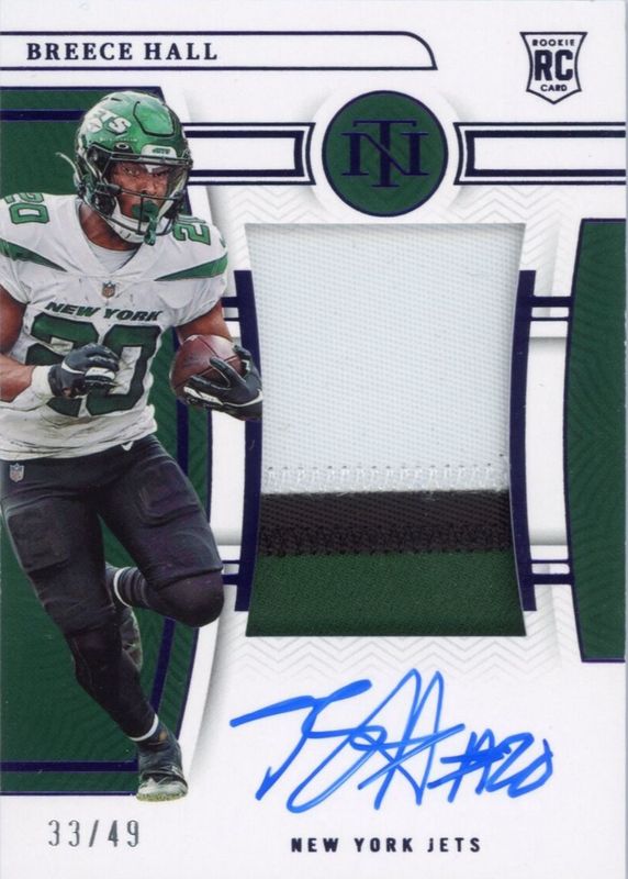 This card is 1 of 13 Breece Hall's card variations in the 2022 National Treasures set being tracked by Sports Card Investor, including Rookie Patch Auto /99, Rookie Patch Auto - Holo Silver /25, Rookie Patch Auto - Stars & Stripes Holo Silver /25, Rookie Patch Auto - Midnight /20, and Rookie Patch Auto - Holo Gold /10.