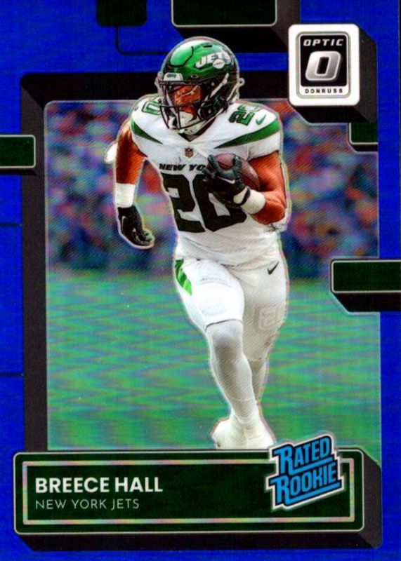 The Breece Hall 2022 Optic #214 Blue /179 Rookie card in Raw condition has not changed in price in the last 30 days and was last sold for $7.50 .