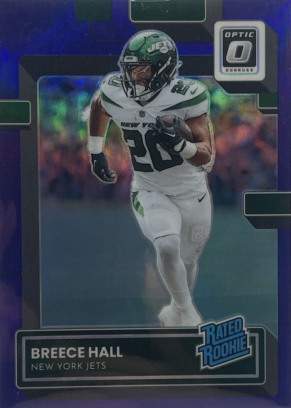 The Breece Hall 2022 Optic #214 Purple /50 Rookie card in Raw condition has not changed in price in the last 30 days and was last sold for $35.00 .