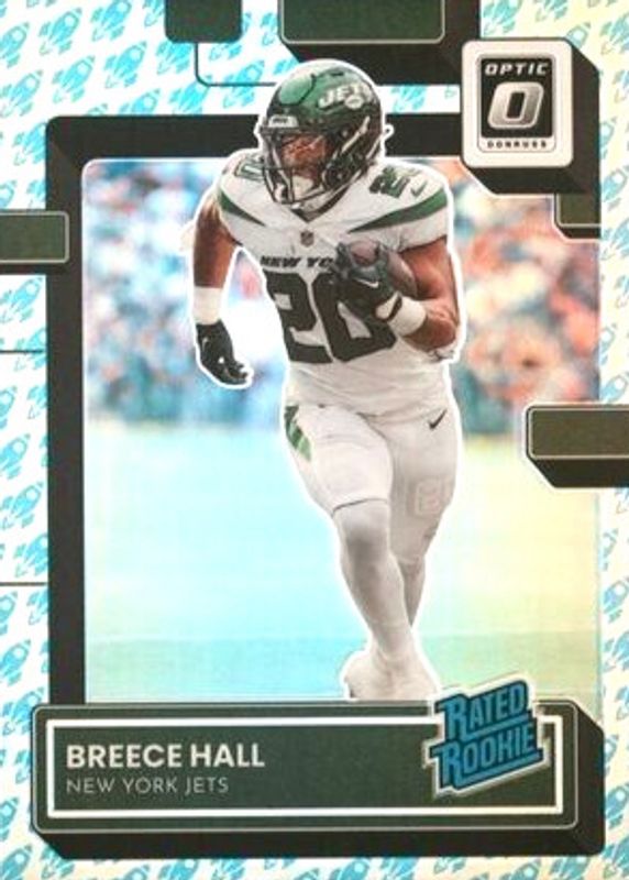The Breece Hall 2022 Optic #214 Rocket /(SSP) Rookie card in Raw condition has not changed in price in the last 30 days and was last sold for $13.37 .
