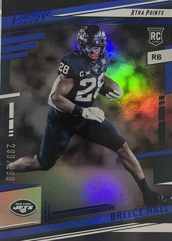 The Breece Hall 2022 Prestige #313 Xtra Points Blue /299 Rookie card in Raw condition has not changed in price in the last 30 days and was last sold for $1.75 .