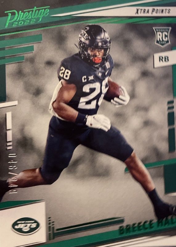 The Breece Hall 2022 Prestige #313 Xtra Points Premium Green /249 Rookie card in Raw condition has not changed in price in the last 30 days and was last sold for $3.00 .