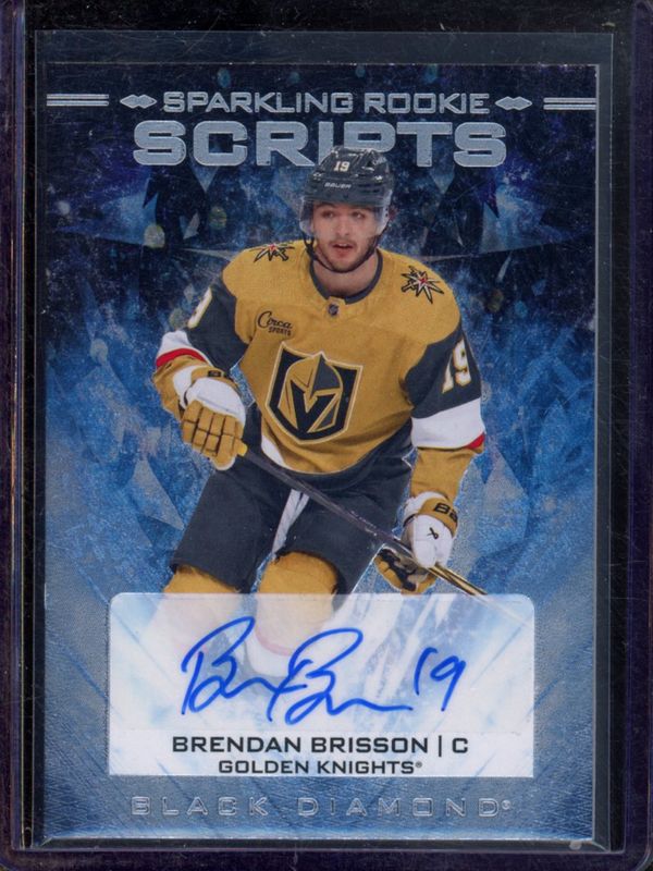 The Brendan Brisson 2024 Upper Deck Black Diamond #SRS-BB Sparkling Rookie Scripts card is 1 of 42 Brendan Brisson's card variations in the 2024 Upper Deck Black Diamond set being tracked by Sports Card Investor, including Base /349, Diamond Relic Rookies /99, Premium Relics /50, Autographs /49, and Diamond Relic Rookies Emerald /10.