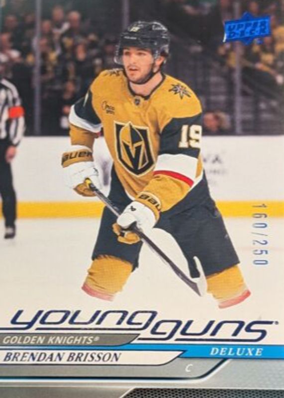 The Brendan Brisson 2024 Upper Deck #226 Young Guns - Deluxe /250 Rookie card in Raw condition has not changed in price in the last 30 days and was last sold for $4.25 .