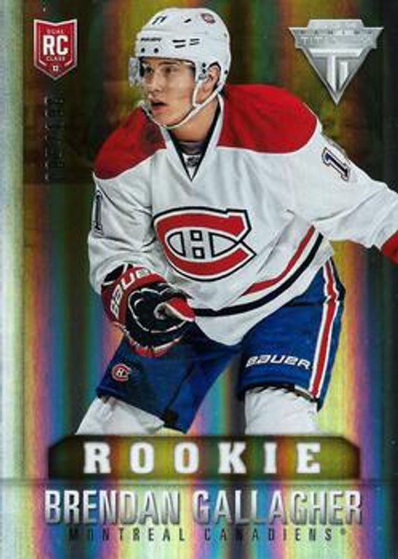The Brendan Gallagher 2013 Titanium #218 Hobby Draft Position /20 Rookie card is 1 of 19 Brendan Gallagher's card variations in the 2013 Titanium set being tracked by Sports Card Investor, including Base /91, Commons Retail /299, Commons Retail Red /99, Commons Retail Gold /10, and Printing Plates Black /1.