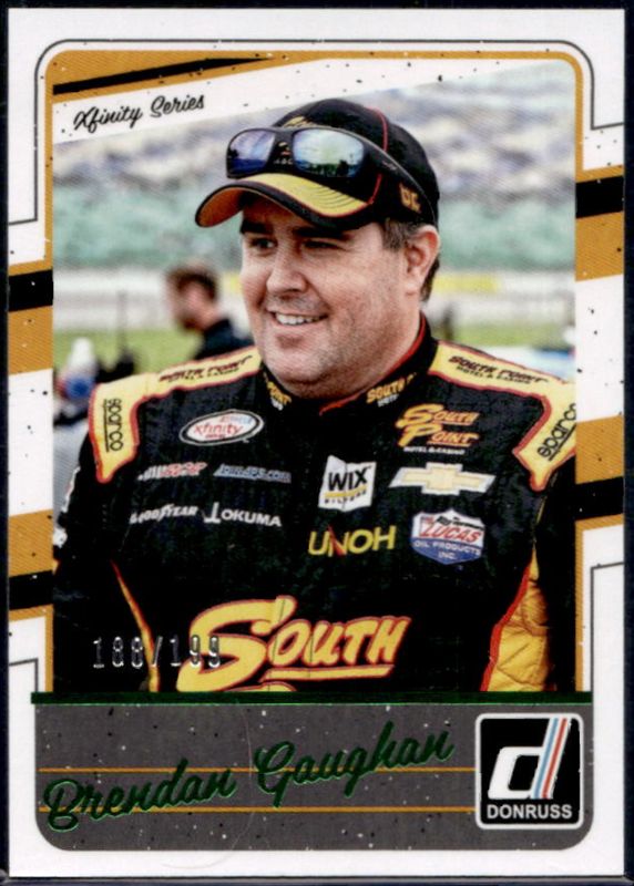 The Brendan Gaughan 2017 Donruss NASCAR #79 Green Foil /199 card is 1 of 19 Brendan Gaughan's card variations in the 2017 Donruss NASCAR set being tracked by Sports Card Investor, including Base, Gold Foil /499, Blue Foil /299, Press Proof /49, and Artist Proof /25.